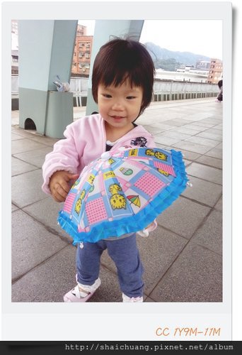 為了讓一直說怕怕的CC分心 在火車站買了一把小傘讓她玩
