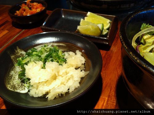 這一盤調味的青蔥洋蔥是美味關鍵 沾上一點就酸甜可口