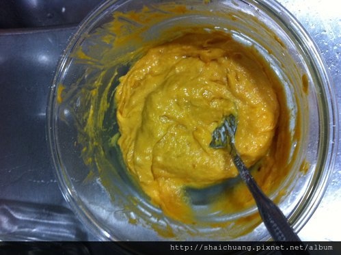 把地瓜和蛋黃拌云成糊狀在倒入母奶,最後加低筋麵粉喇成勾勾就對了