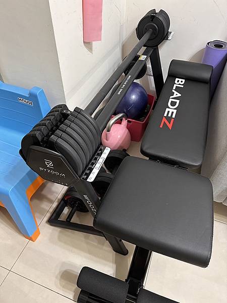 含槓鈴架、W槓和直槓,最重 36kg 的可調式啞鈴 (展示品價 5500),朋友說夠我練很久了。