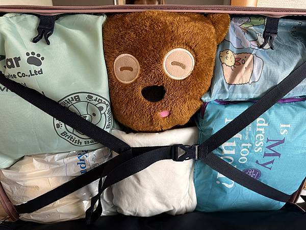 最後要讓 CC 夾到的熊曝光囉,在新買的 28 吋行李箱擠滿滿的樣子,下半身被蓋上了棉被,塞完自己都覺得好笑。